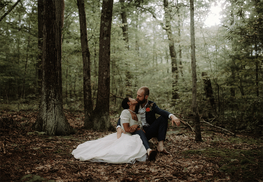 Couple sitting on the forest floor in Upstate New York, sharing a quiet kiss surrounded by trees during their intimate backyard wedding